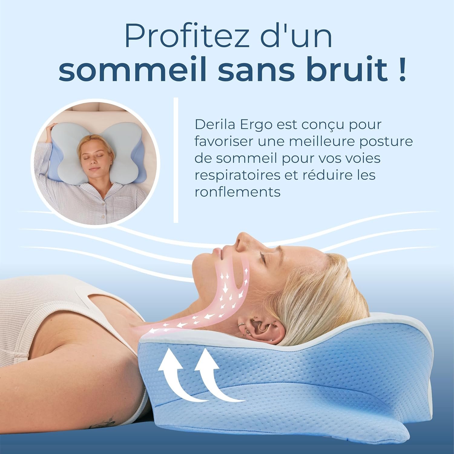 - Élargit les voies respiratoires : en maintenant la colonne vertébrale alignée, Derila Ergo permet à l’air de circuler librement dans les poumons, réduisant ainsi les ronflements et améliorant l’oxygénation pendant la nuit.