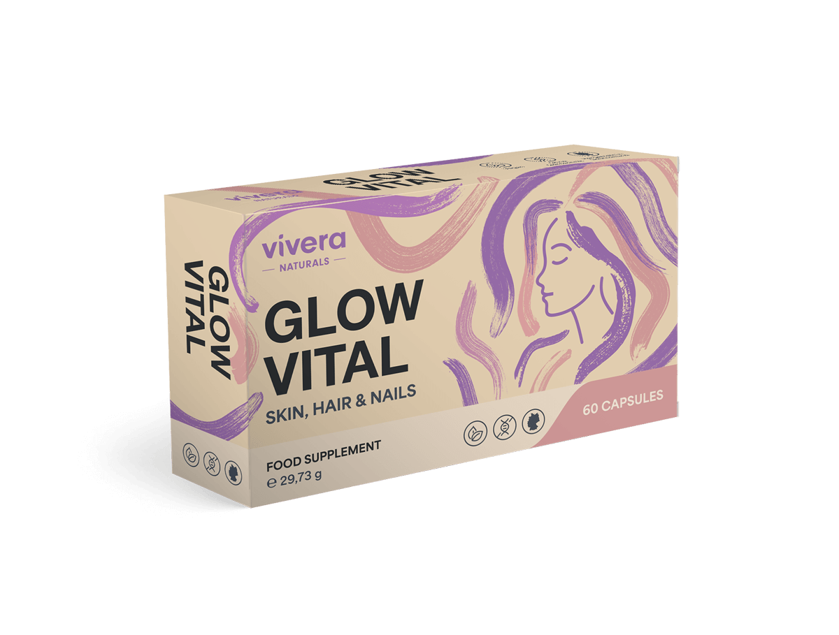 Glow Vital est un complément alimentaire en capsules avec zinc, vitamines et extraits végétaux pour accompagner la beauté de la peau, des cheveux et des ongles.